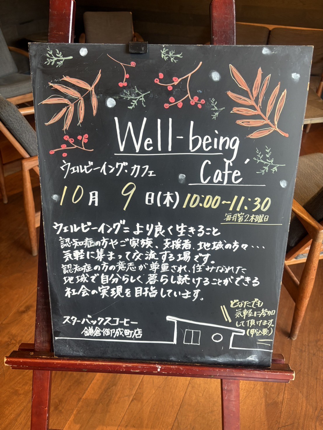 9月11日(木)スターバックスコーヒー鎌倉御成町店にて、当院主催のウェルビーイング☆カフェ鎌倉を実施致しました。皆様 に感謝申し上げます。 10時のお茶をする方。少し遅めのモーニングをとる方。ここでは毎回それぞれの朝が繰り広げられます『それ美味しそうね』『半分要る?切ってもらおうか』自由に好きなものを頼めるからこその会話に、スタッフも癒されております ウェルビーイング☆カフェ鎌倉は、「暮らしの延長線上にある認知症カフェ」をコンセプトに、地域に暮らす人が健康な頃から認知症 になっても継続して同じ場所で過ごせることを目的とした環境作り に努めています。ご興味のある方は当クリニックまでお気軽にお問 い合わせください。 次回は、10月9日(木)10時に開催予定です。みなさまの参加を心よりお待ちしております。鎌倉脳神経MRIクリニック 046 723 6737 -